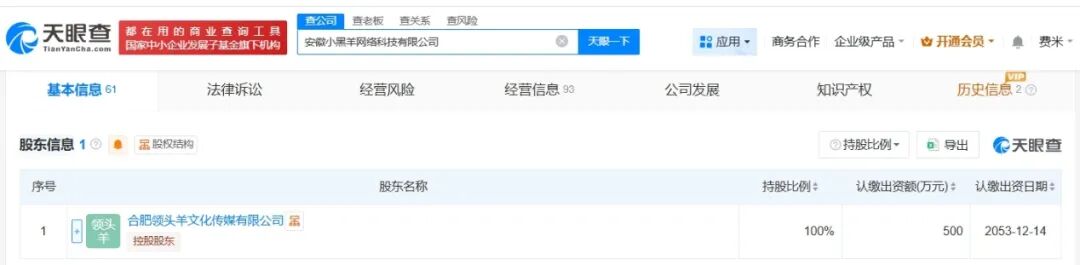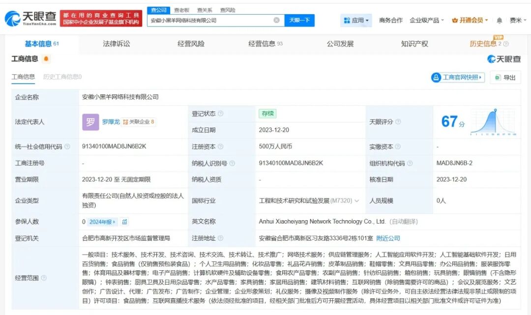 天眼查App显示,安徽小黑羊网络科技有限公司成立于2023年12月,法定代表人为罗厚龙,注册资本500万人民币,经营范围包括网络技术服务、供应链管理服务、人工智能应用软件开发等,由合肥领头羊文化传媒有限公司全资持股。
