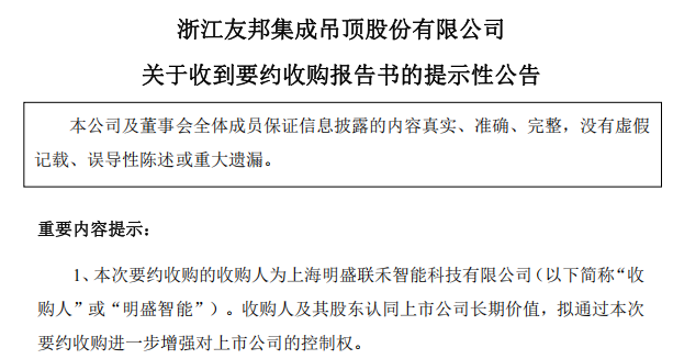 友邦吊顶(002718.SZ)近日公告称,收购人上海明盛联禾智能科技有限公司(下称明盛智能)拟以29.41元/股价格,向公司全体股东发出部分要约收购,计划收购股份1943.01万股,占公司总股本的15.01%。本次要约收购期限为2月25日至3月26日。