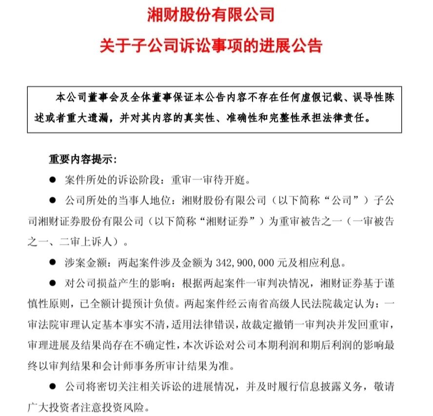 2025 年1月,湘财证券因不服上述一审判决,提起了上诉。2025 年7月,湘财证券收到云南省高级人民法院《民事裁定书》,裁定撤销云南省昆明市中级人民法院一审判决,两起案件发回云南省昆明市中级人民法院重审。