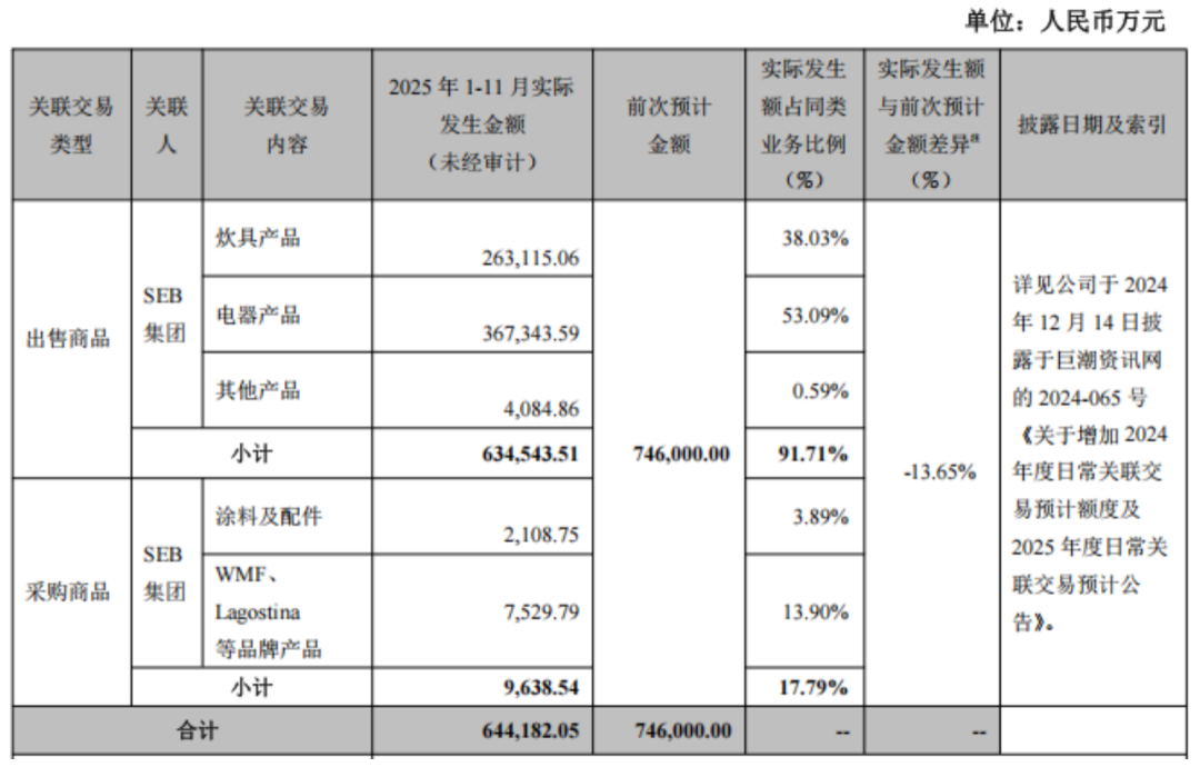 据苏泊尔2025年12月披露的信息,2025年1月至11月,其向SEB S.A.及其附属公司出售商品实际发生金额(未经审计)为63.45亿元,与前次预计金额存在一成以上差异。2026年,其拟向关联方SEB集团出售的商品金额约为72.80亿元,后续能否目标达成需看海外需求如何。