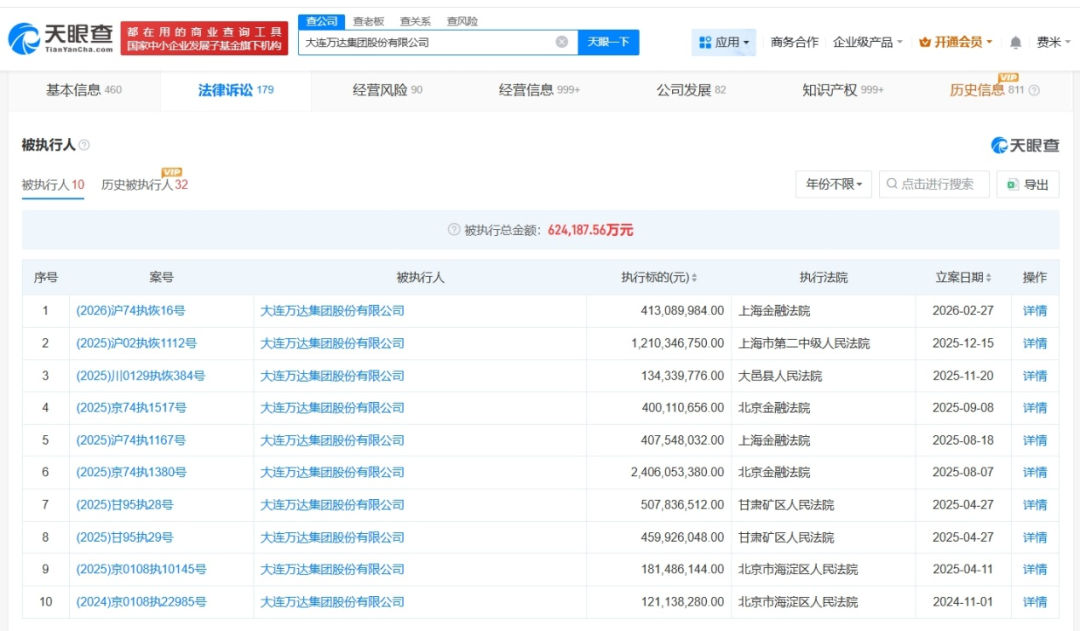 天眼查法律诉讼信息显示,近日,大连万达集团股份有限公司、万达地产集团有限公司等新增1条恢复执行信息,执行标的4.1亿余元,执行法院为上海金融法院。
