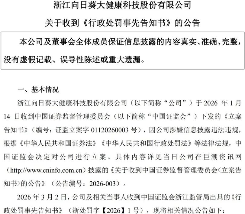 2026年3月2日,浙江向日葵大健康科技股份有限公司(下称向日葵,300111.SZ)及相关当事人收到中国证监会浙江监管局出具的《行政处罚事先告知书》。经查明,向日葵在2025年9月22日披露的交易预案中称,公司拟通过发行股份及支付现金的方式购买兮璞材料100%股权、浙江贝得药业有限公司40%股权,并募集配套资金。