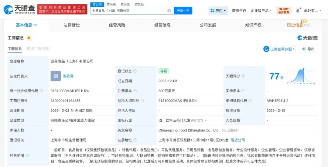 天眼查工商信息显示,IF关联公司创星食品(上海)有限公司成立于2025年12月,法定代表人为谢欣冀,注册资本300万美元,经营范围含食品销售、销售代理、食品进出口、采购代理服务、日用品销售、食品添加剂销售、专业设计服务等。
