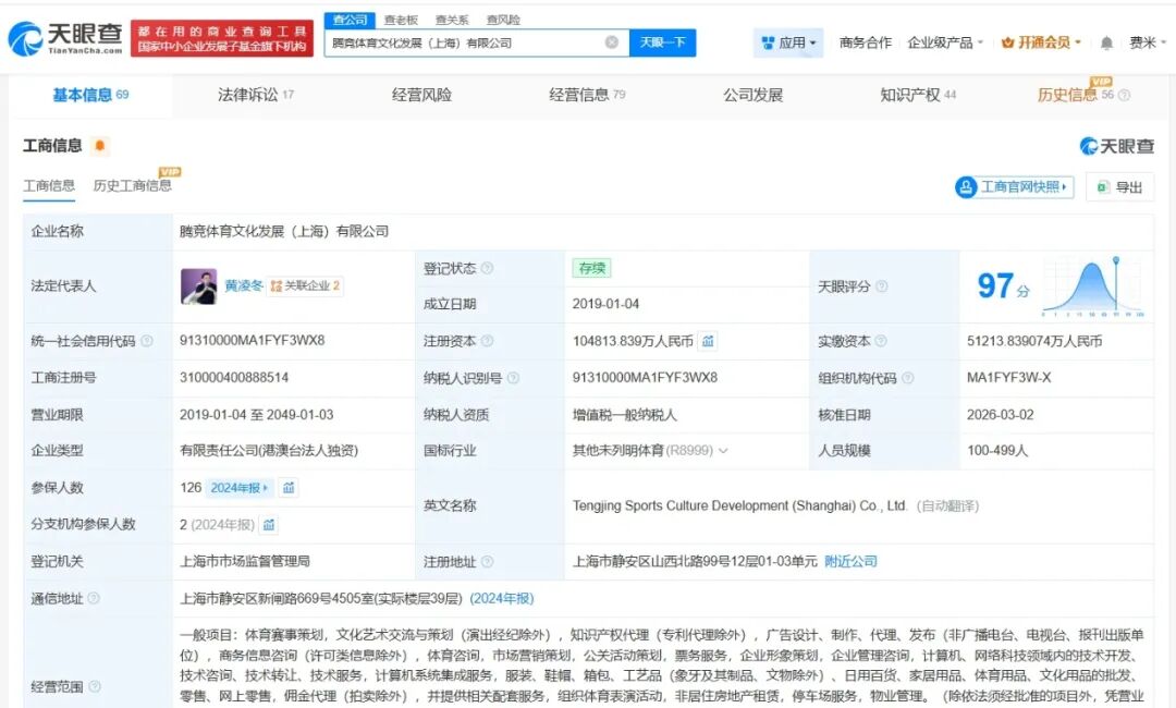 腾竞体育文化发展(上海)有限公司成立于2019年1月,法定代表人为黄凌冬,经营范围包括体育赛事策划、文化艺术交流与策划、市场营销策划等。