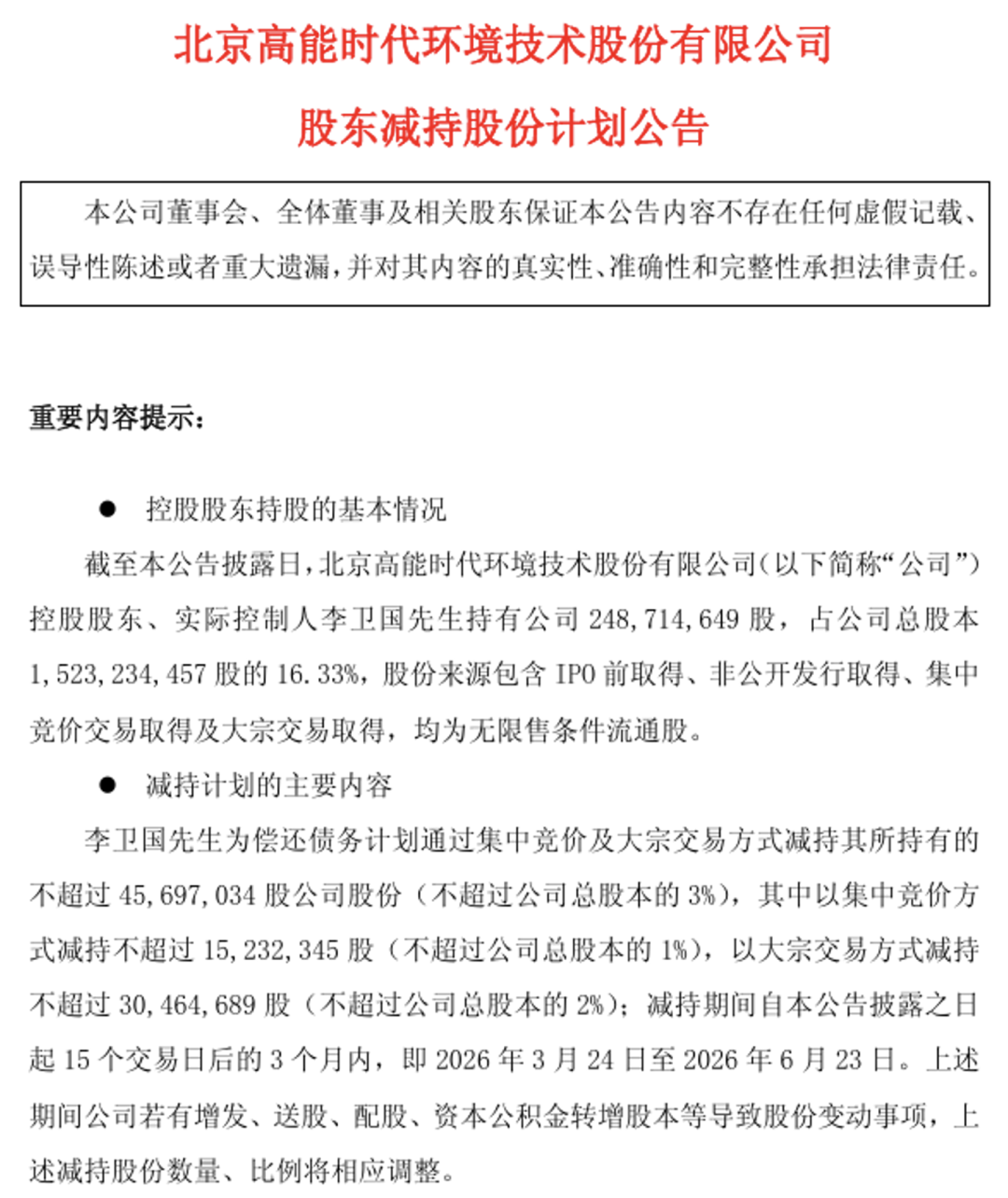 股价创新高之际实施减持,既是实控人缓解自身资金压力的现实安排,也折射出高能环境前期快速扩张过程中积累的经营与资金压力,或已传导至控股股东层面