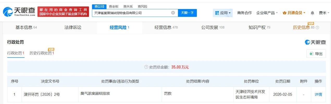 天眼查经营风险信息显示,近日,天津雀巢普瑞纳宠物食品有限公司因臭气浓度超标排放,被天津经济技术开发区生态环境局罚款35万元。
