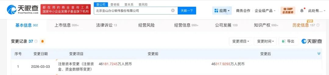 天眼查工商信息显示,近日,金山办公(688111)发生工商变更,注册资本由约4.62亿人民币增至约4.63亿人民币。