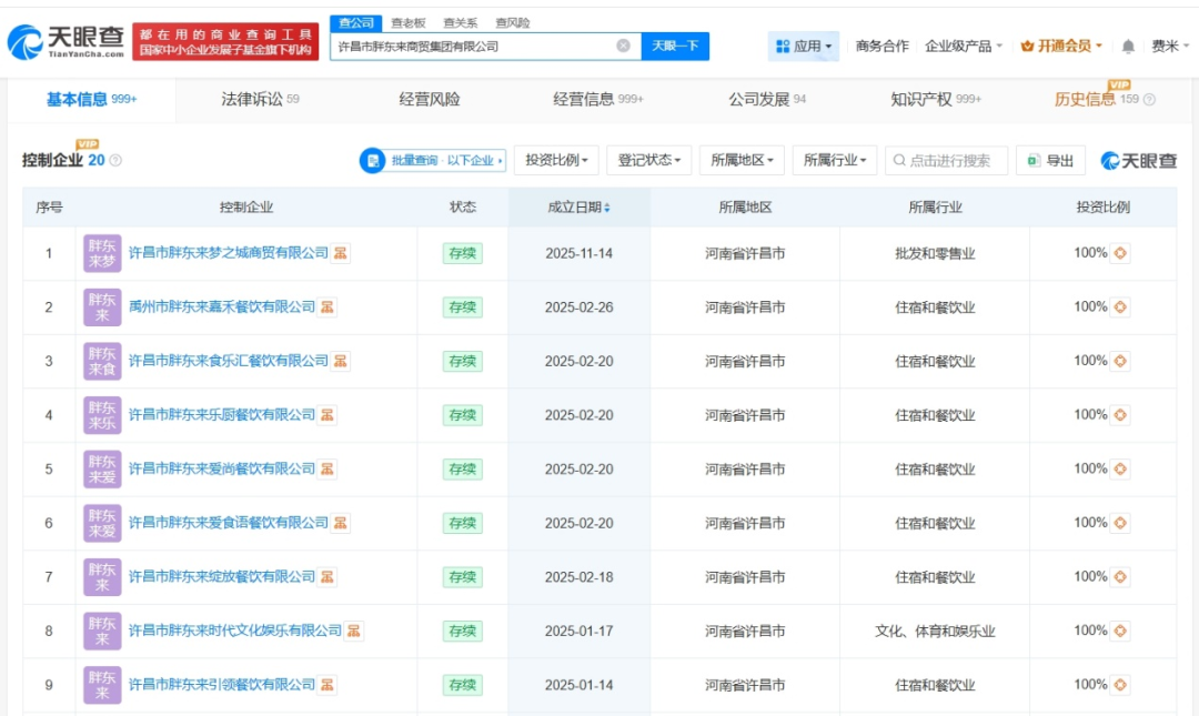 许昌市胖东来商贸集团有限公司控制20家企业,去年成立近十家新公司