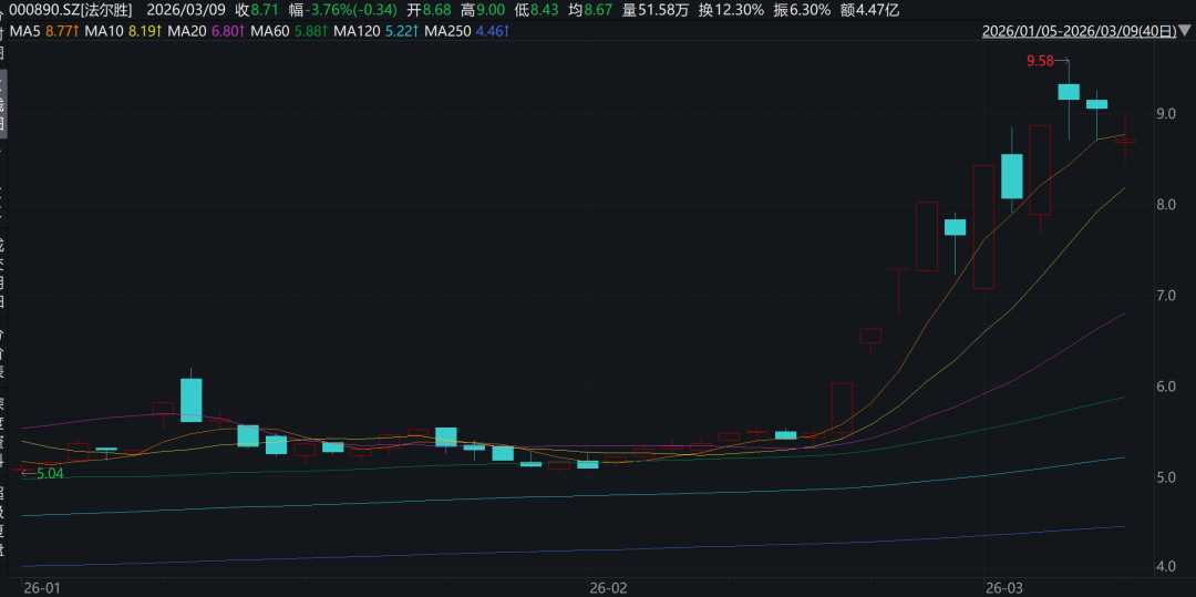 公告发布后的3月5日,法尔胜虽仍大幅高开,但最终以9.15元/股(不复权)收盘。3月9日,法尔胜股价以8.68元/股开盘,前述涨势未能延续。