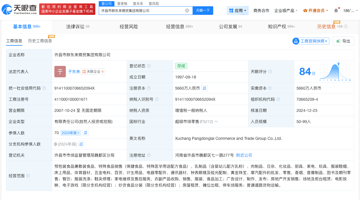 天眼查工商信息显示,胖东来关联企业许昌市胖东来商贸集团有限公司成立于1997年9月,法定代表人为于东来,注册资本5660万人民币,经营范围包括房地产开发销售、场地及柜台租赁、炒货食品分装等。