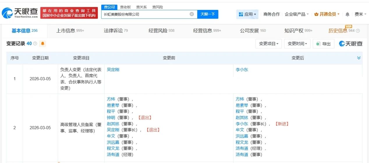 天眼查App显示,近日,长虹美菱(000521.SZ)发生工商变更,吴定刚卸任法定代表人、董事长,由李小东接任。同时,部分高管发生变更。