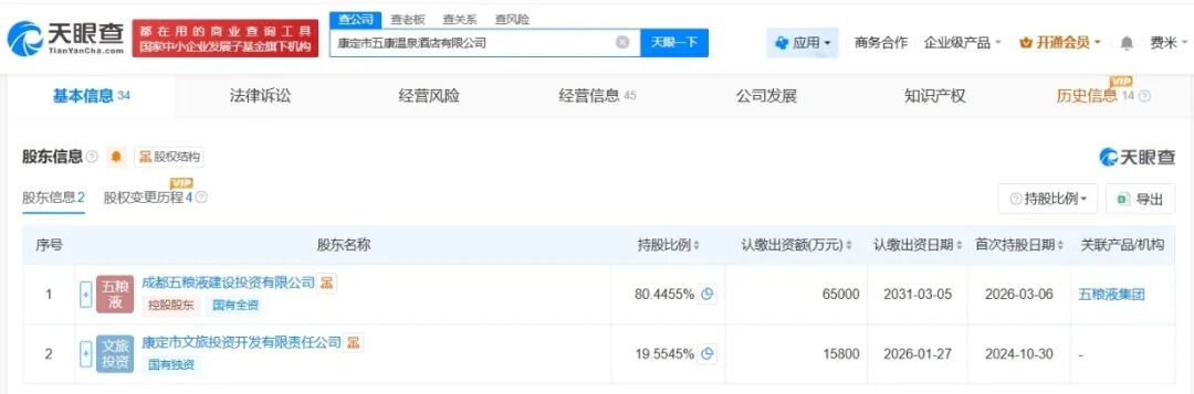天眼查工商信息显示,近日,康定市五康温泉酒店有限公司发生工商变更,新增五粮液集团旗下成都五粮液建设投资有限公司为股东,注册资本由1.58亿人民币增至8.08亿人民币,增幅约411%,沈智杰卸任法定代表人,由颜江接任,同时,多位主要人员发生变更。