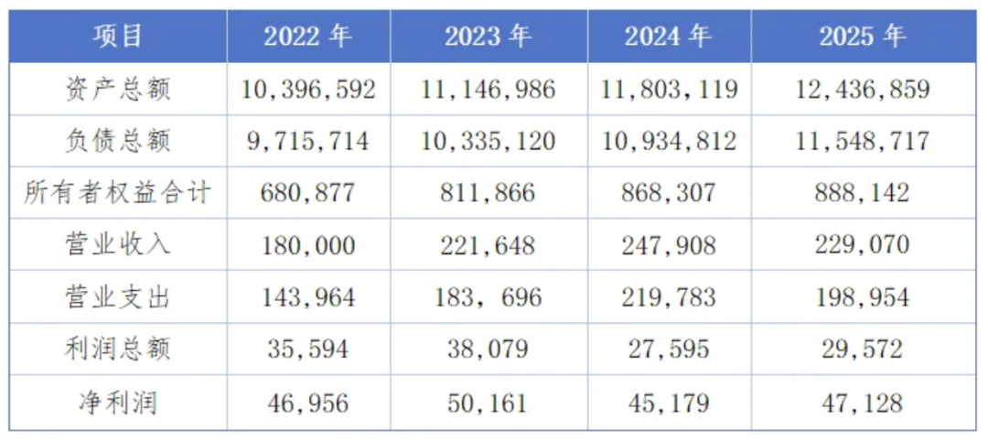 截至2025年末(2025年数据未经审计),海南银行资产总额、负债总额分别为1243.69亿元、1154.87亿元,同比分别增长5.37%、5.61%;所有者权益合计88.81亿元,同比增长2.28%。