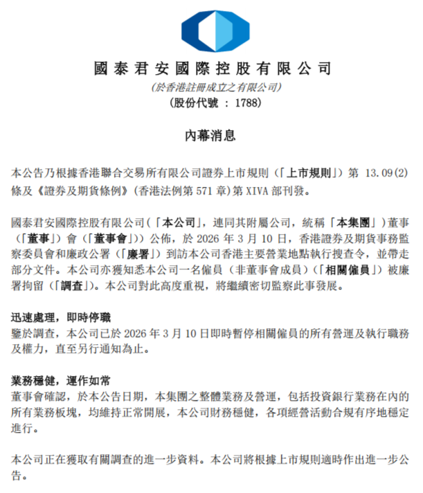 3月12日盘前,国泰君安国际控股有限公司 (下称国泰君安国际,1788.HK)突然公告有雇员被拘留调查。当天,香港证券及期货事务监察委员会(下称香港证监会)和廉政公署公告打击涉嫌内幕交易及贪污行为。