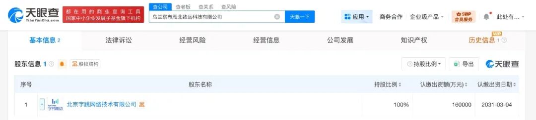 天眼查工商信息显示,近日,乌兰察布雁北致远科技有限公司成立,法定代表人为董佳建,注册资本16亿人民币,经营范围包括信息技术咨询服务、软件开发、信息系统集成服务等。股东信息显示,该公司由字节跳动旗下北京字跳网络技术有限公司全资持股。