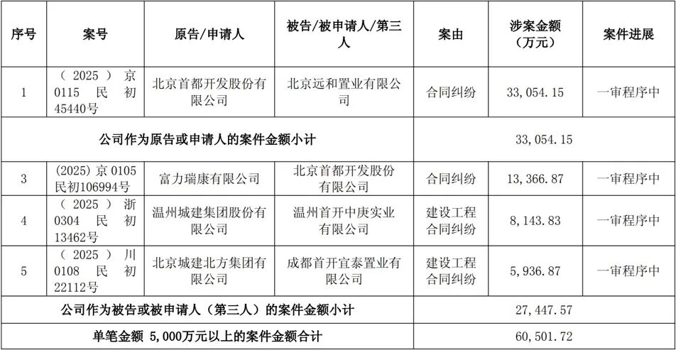 首开股份诉讼、仲裁金额5000万元以上新增案件信息