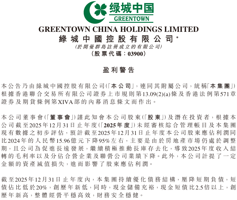 绿城中国2025年盈利预警公告
