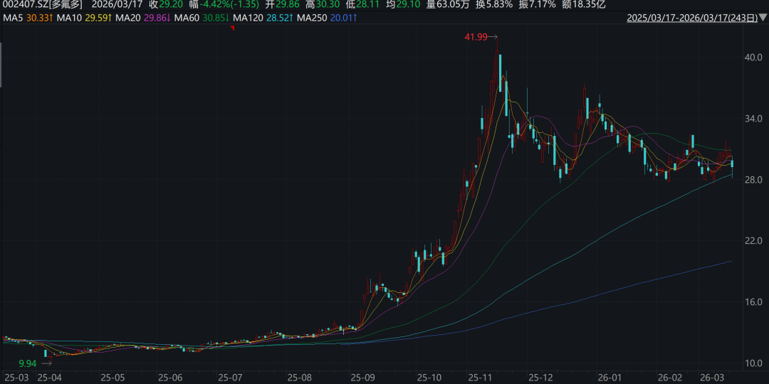 从市场反馈来看,尽管公司在开盘前发布了声明,但当日开盘,多氟多股价低开,盘中最低触及30.01元/股,随后有所拉升,至收盘报30.55元/股,微跌0.97%。截至3月17日午时,多氟多收于29.2元/股,股价下跌4.42%。