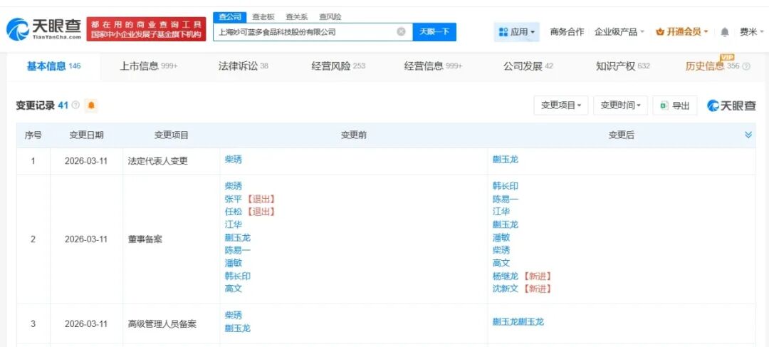 天眼查工商信息显示,近日,妙可蓝多(600882)发生工商变更,创始人柴琇卸任法定代表人,由蒯玉龙接任。