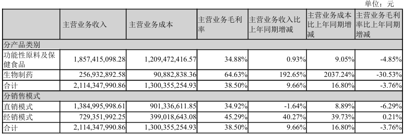 过去一年,新诺威全力通过提升销量来巩固市场份额,让功能性原料及保健食品业务全年实现销售收入18.57亿元,占公司总营收的86%,依旧是公司营收的绝对主力,但该业务在2025年的毛利率仍同比下降4.85个百分点,至34.88%。