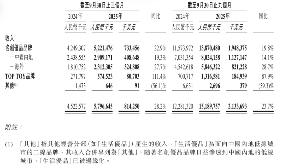 2025年前三季度名创优品收入情况(千元、%)