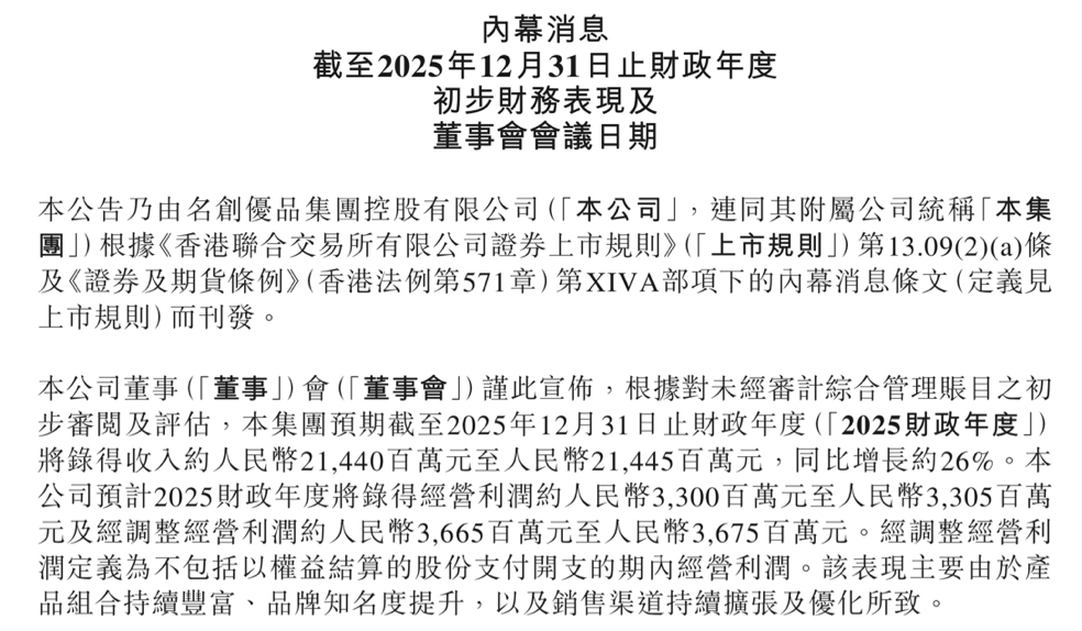 数据显示,2025财年,公司将录得收入约214.40亿元至214.45亿元,同比增长约26%;预计将录得经营利润约33亿元至33.05亿元及经调整经营利润约36.65亿元至36.75亿元,均较上年同期有所增长。不过,名创优品预计将录得年内利润约13.20亿元至13.30亿元,与上年同期26.35亿元相比,降幅约50%。