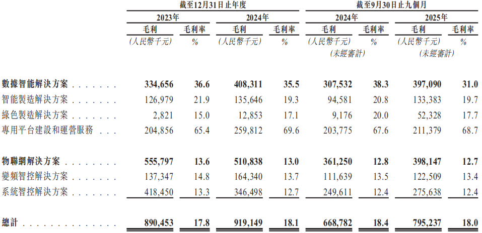 为何卡奥斯毛利率水平难以达到高位?根源或在于公司业务结构失衡。报告期内,卡奥斯数据智能解决方案业务毛利率较高,在30%以上,但收入占比仅在20%左右,2025年1—9月占比增至29.0%;物联网解决方案业务的毛利率在13%左右,收入占比却超七成。这种业务结构,使得该公司整体盈利能力受到拖累。