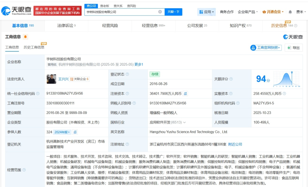 天眼查App显示,宇树科技股份有限公司成立于2016年8月,法定代表人为王兴兴,注册资本约3.64亿人民币,经营范围包括智能机器人的研发、工业机器人制造、服务消费机器人制造等。股东信息显示,该公司由王兴兴、美团旗下汉海信息技术(上海)有限公司、雷军名下顺为资本关联公司Astrend IV (Hong Kong) Alpha Limited等共同持股。