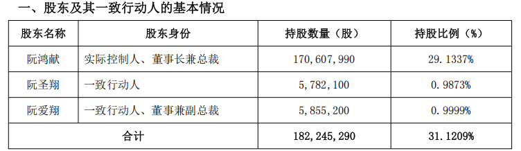 值得一提的是,截至公告披露日,阮鸿献持股约1.71亿股、持股比例为29.13%;阮圣翔、阮爱翔分别持股578.21万股、585.52万股,持股比例均约为1%。两人目前所持有股份或也是阮鸿献转让而来。