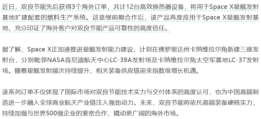 2026年2月12日13时02分,双良集团微信公众号率先发布《双良节能再获海外订单,助力商业航天太空探索》一文,13时25分,双良节能公众号同步转发相同内容。文章宣称公司获得3个海外订单、12台高效换热器,用于SpaceX星舰发射基地扩建配套燃料生产系统。