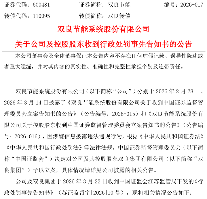 双良节能关于公司及控股股东收到行政处罚事先告知书的公告