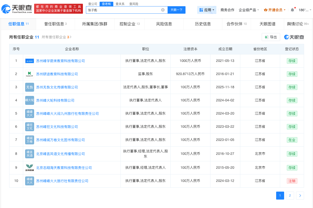 天眼查App显示,张雪峰(张子彪)名下关联11家企业,其中9家企业处于存续状态,包括苏州峰学蔚来教育科技有限公司、苏州研途教育科技有限公司、北京峰言风语文化传播有限公司等,张子彪在上述企业担任执行董事、法定代表人等职务。