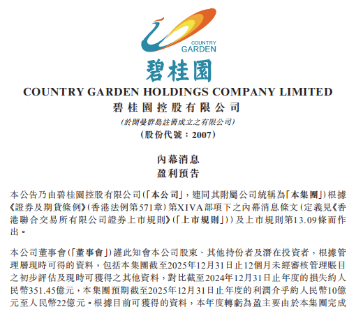 碧桂园发布盈利预告
