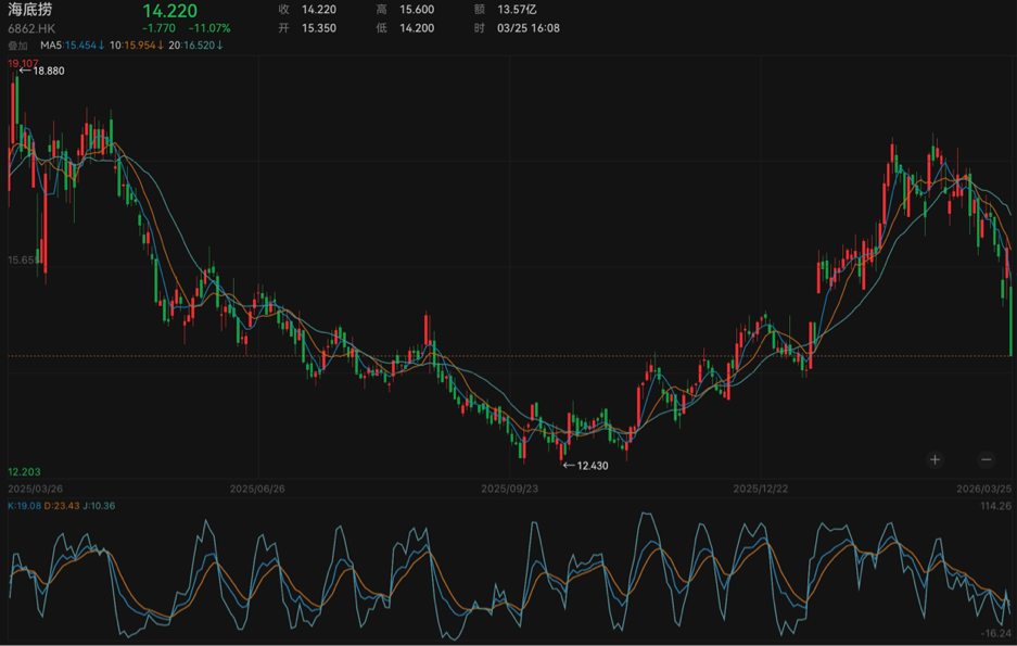 二级市场方面,业绩发布次日,海底捞股价低开低走。截至3月26日午盘,该股报14.01港元/股,总市值约为780亿港元。