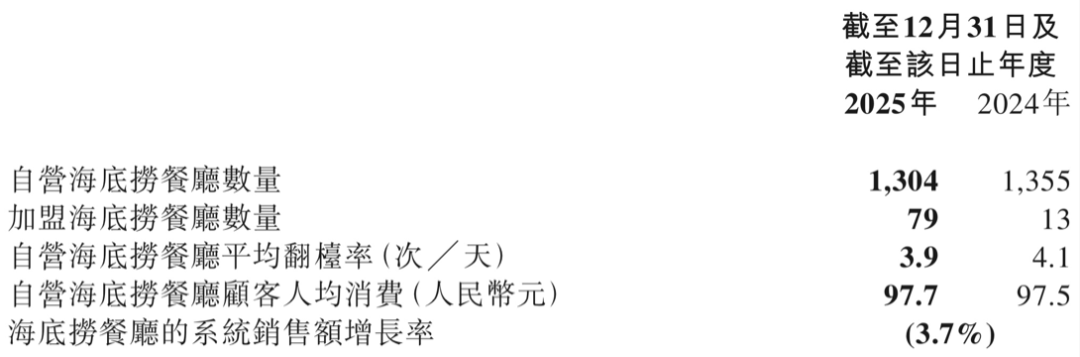 在核心经营指标上,2025年自营海底捞餐厅整体翻台率为3.9次/天,2024年为4.1次/天;全年共接待顾客3.84亿人次,较上年下降7.5%。