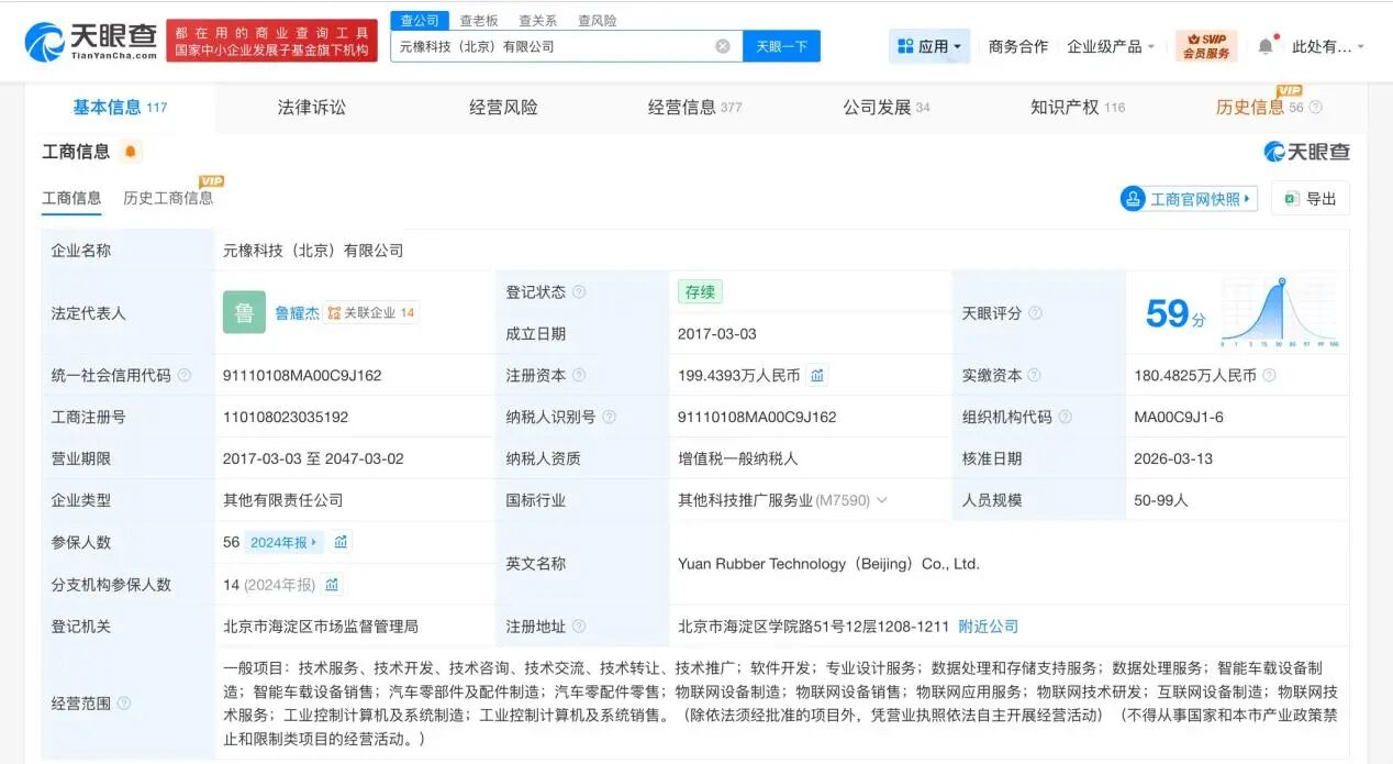 元橡科技(北京)有限公司成立于2017年3月,法定代表人为鲁耀杰,经营范围含专业设计服务、数据处理和存储支持服务、数据处理服务、智能车载设备制造、智能车载设备销售、物联网技术研发等。股东信息显示,该公司现由鲁耀杰、唐山红土创业投资有限公司、北京北斗海松产业发展投资中心(有限合伙)及上述新增股东等共同持股。