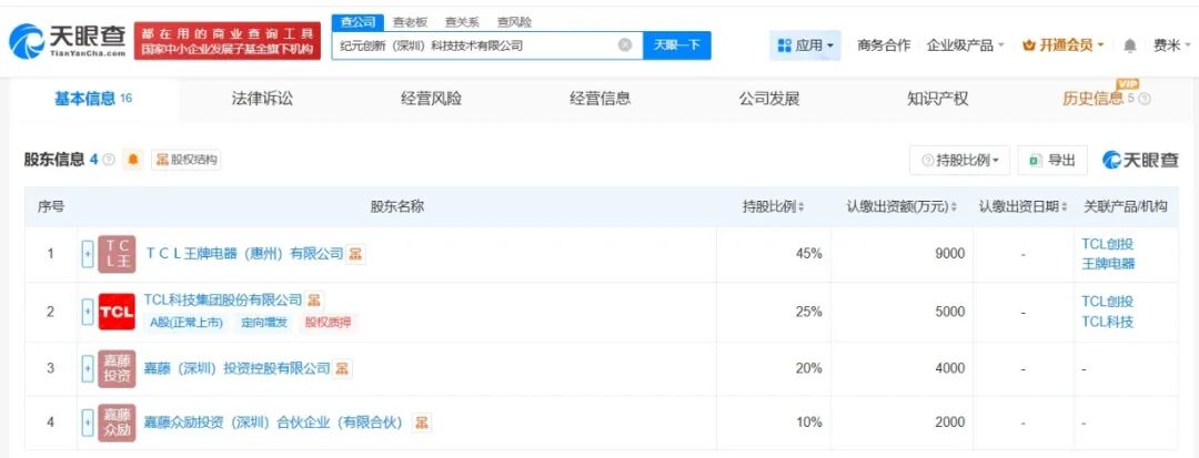 天眼查App显示,3月27日,纪元创新(深圳)科技技术有限公司成立,法定代表人为杨进,注册资本2亿人民币,经营范围包括工程和技术研究和试验发展、人工智能基础软件开发、人工智能应用软件开发等,由TCL科技(000100)、TCL王牌电器(惠州)有限公司、嘉藤(深圳)投资控股有限公司、嘉藤众励投资(深圳)合伙企业(有限合伙)共同持股。
