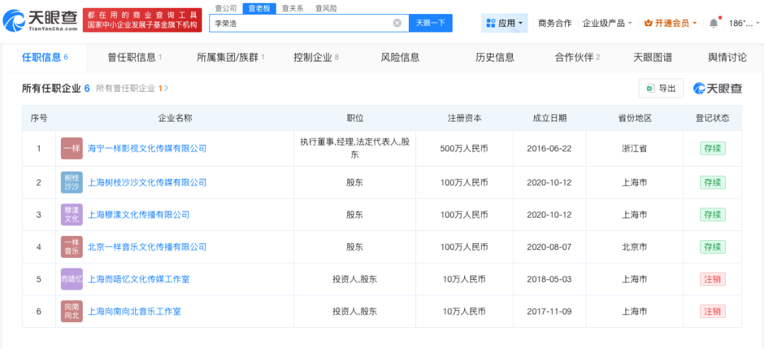 李荣浩名下关联6家企业,其中4家处于存续状态,包括海宁一样影视文化传媒有限公司、上海树枝沙沙文化传媒有限公司、上海穆漾文化传播有限公司、北京一样音乐文化传播有限公司,李荣浩在上述企业担任法定代表人、执行董事等职务。