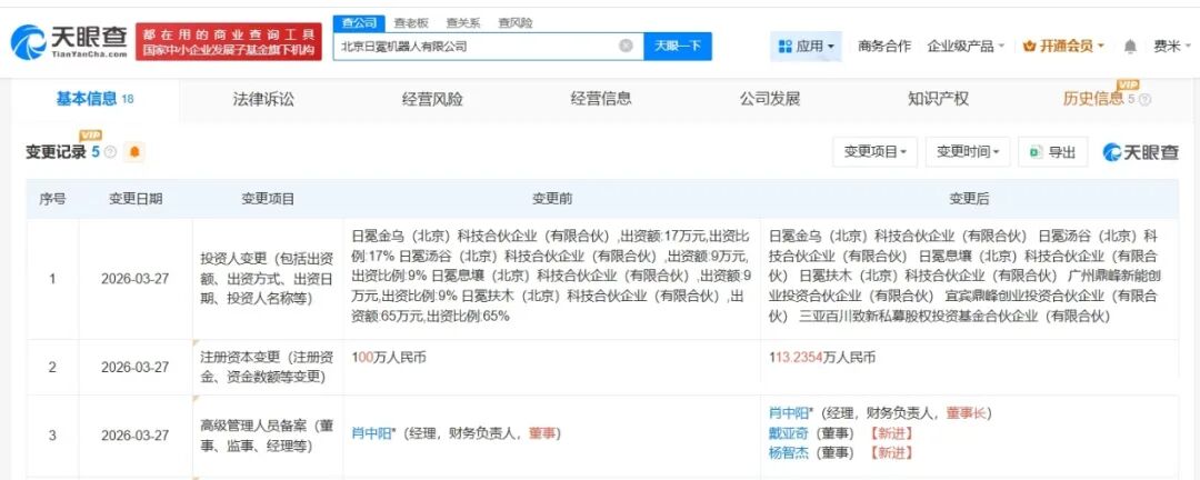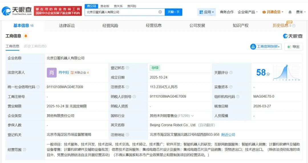 该公司成立于2025年10月,法定代表人为肖中阳,经营范围包括智能机器人的研发、互联网数据服务、智能机器人销售等,现由日冕息壤(北京)科技合伙企业(有限合伙)、日冕汤谷(北京)科技合伙企业(有限合伙)及上述新增股东等共同持股。