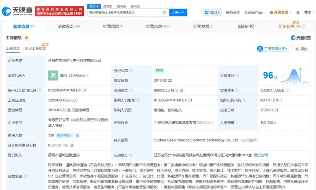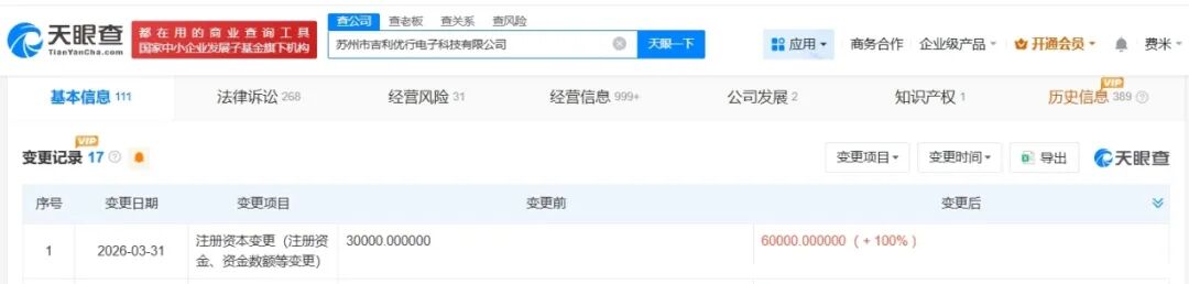 天眼查App显示,近日,苏州市吉利优行电子科技有限公司发生工商变更,注册资本由3亿人民币增至6亿人民币,增幅100%。