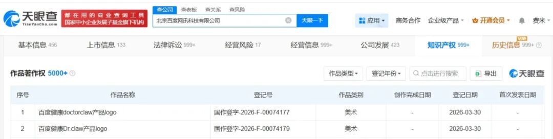 天眼查知识产权信息显示,近日,北京百度网讯科技有限公司登记“百度健康doctorclaw产品logo”“百度健康Dr.claw产品logo”作品著作权,作品类别均为美术。