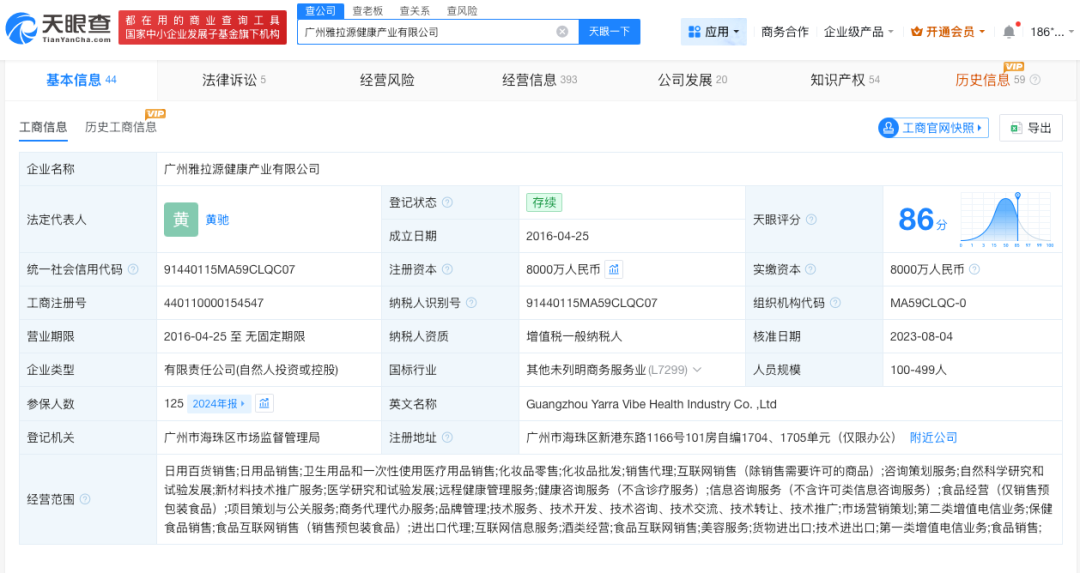广州雅拉源健康产业有限公司成立于2016年4月,法定代表人为黄驰,注册资本8000万人民币,经营范围包括日用百货销售、日用品销售、卫生用品和一次性使用医疗用品销售等,由黄驰、陈进共同持股。