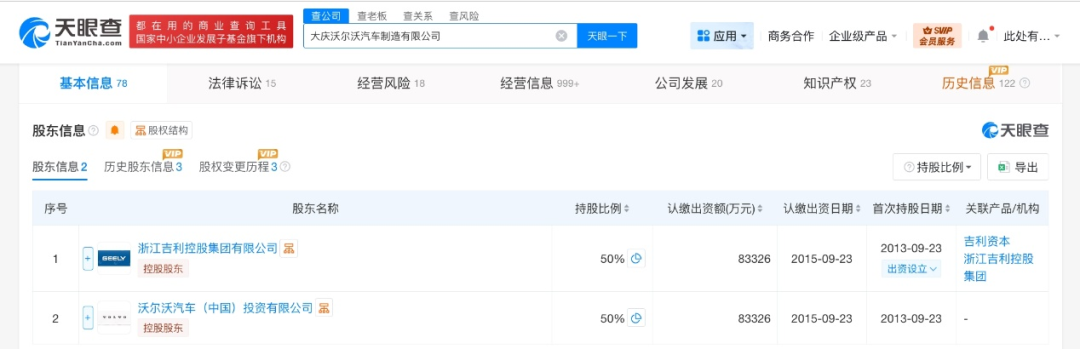 大庆沃尔沃汽车制造有限公司成立于2013年9月,法定代表人为袁小林,注册资本约16.7亿人民币,经营范围含制造汽车及其零部件,销售、分销和出口合资公司和合资公司投资企业制造的产品,从事国产沃尔沃汽车的出口,汽车相关技术的研发等。股东信息显示,该公司由浙江吉利控股集团有限公司、沃尔沃汽车(中国)投资有限公司各持股50%。