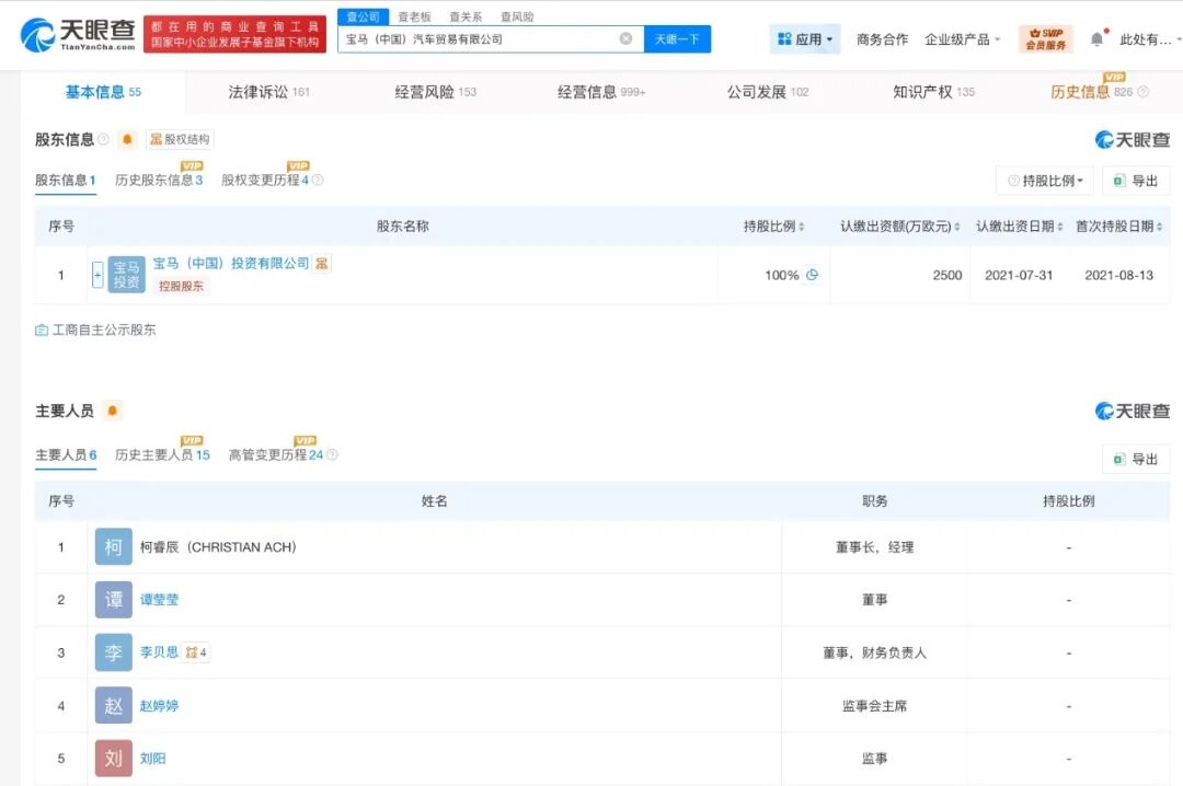 宝马(中国)汽车贸易有限公司成立于2005年9月,注册资本2500万欧元,经营范围包括作为宝马集团BMW、MINI和Rolls-Royce品牌进口汽车在国内的总经销商等。股东信息显示,该公司由宝马(中国)投资有限公司全资持股。