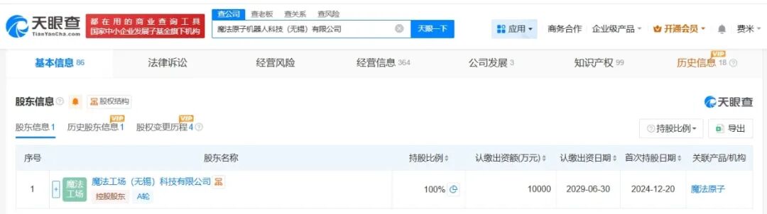 该公司成立于2023年12月,法定代表人为陈春玉,注册资本1亿人民币,经营范围包括智能机器人的研发、工业机器人制造、服务消费机器人制造等,由魔法工场(无锡)科技有限公司全资持股。