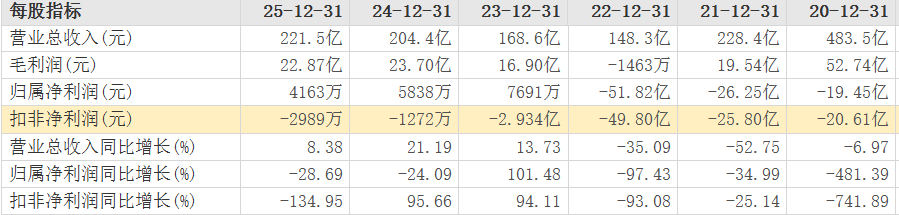 年报数据显示,公司营收同比增长8.38%至221.5亿元,但归母净利润却同比下滑28.69%,降至4163.42万元。其扣非后归母净利润亏损更是同比扩大逾一倍至2988.77万元,值得关注的是,这已是公司该项指标连续6年处于亏损状态。