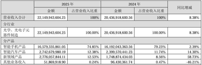 数据显示,智能手机作为核心基本盘,2025年实现收入165.79亿元,同比增长2.39%,但盈利能力持续弱化。2025年,公司手机光学模组业务毛利率同比下滑1.72个百分点至9.72%,不仅低于公司2019年至2021年10%~13%的历史平均水平,也弱于当前行业11%~15%的平均水平。