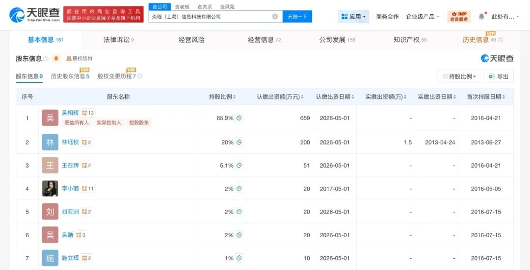 炎程(上海)信息科技有限公司成立于2013年6月,法定代表人为王淑荣,注册资本1000万人民币,经营范围含信息科技、计算机科技专业领域内的技术开发、技术转让、技术咨询、技术服务等。股东信息显示,该公司由吴相辉、林珏桢、李小璐等共同持股。