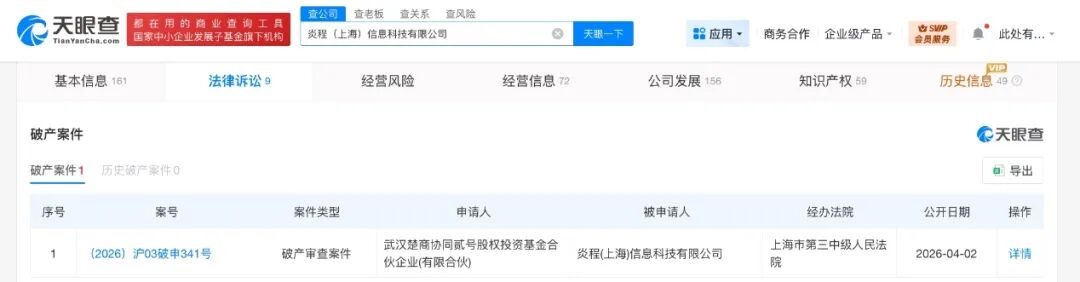 天眼查法律诉讼信息显示,近日,炎程(上海)信息科技有限公司新增一则破产审查案件,申请人为武汉楚商协同贰号股权投资基金合伙企业(有限合伙),经办法院为上海市第三中级人民法院。