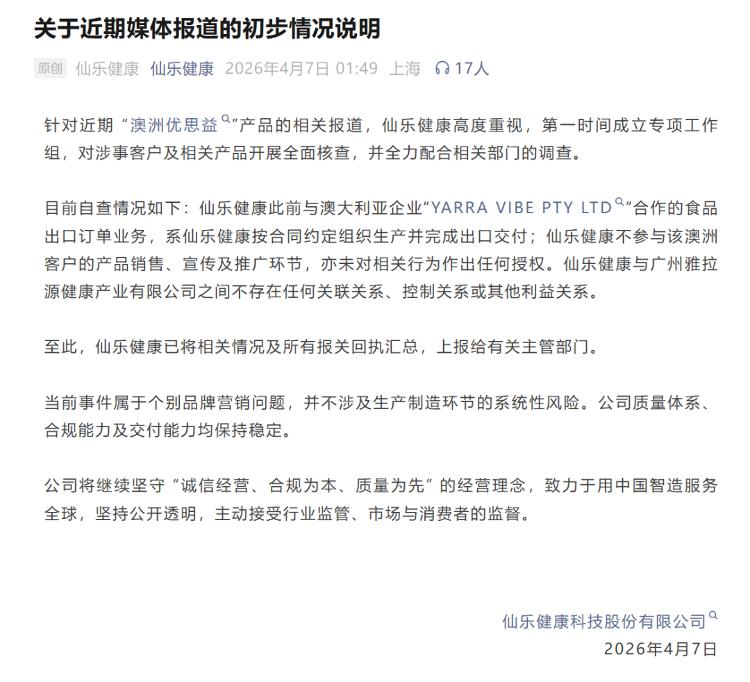 公司表示,针对近期“澳洲优思益”产品的相关报道,仙乐健康高度重视,第一时间成立专项工作组,对涉事客户及相关产品开展全面核查,并全力配合相关部门的调查。目前自查情况如下:仙乐健康此前与澳大利亚企业“YARRA VIBE PTY LTD”合作的食品出口订单业务,系仙乐健康按合同约定组织生产并完成出口交付;仙乐健康不参与该澳洲客户的产品销售、宣传及推广环节,亦未对相关行为作出任何授权。仙乐健康与广州雅拉源健康产业有限公司之间不存在任何关联关系、控制关系或其他利益关系。